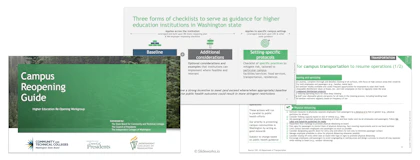 Text-heavy 16 page deck going over guidelines for higher education institutions in Washington state when reopening after COVID-19. Broken into baseline recommendations, optional considerations, and recommended protocols.