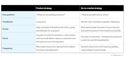 A product strategy defines the “why” and the “what” at a high level — the vision, the customer, the value proposition, and the strategic choices. A product roadmap is more tactical: it covers the “how” and “when,” with specific features, releases, and timelines. The strategy drives the roadmap, not the other way around.