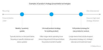The length depends on the type of deck. A weekly or quarterly update can be 5–10 slides. An annual strategy refresh for an existing product is typically 15–25+ slides. A full product strategy for a new product or venture may be 30–100+ slides, often accompanied by a shorter executive summary version.