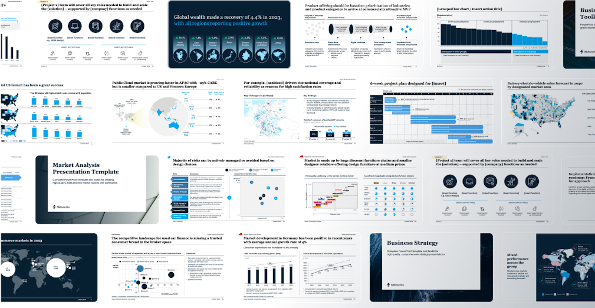 All our templates are created in our own small team of ex-consultants from McKinsey, Bain, and BCG. Between us we have done hundreds of projects in a wide range of topics and industries. We have distilled these many years and thousands of created slides into succinct, easy-to-use templates so you can have your own library of consulting-style resources.